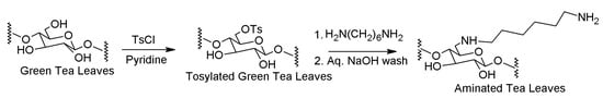 The tosylated tea leaves were subjected to amination using four different diamines to produce four different kinds of aminated tea leaves. The diamines used were hexamethylene diamine (C-6 diamine), 1,8-octanediamine (C-8 diamine), 1,10-decanediamine (C-10 diamine), and 1,12-dodecanediamine (C12-diamine). This resulted in the displacement of the tosyl group by one of the amino groups in the diamine while the second amine group remained attached to the other end. This resulted in a family of aminated tea leaves with the amine functionality tethered at the end of varying chain lengths. Cross-linking was prevented by targeting a 1:8 mole ratio of tosylate functionality to the diamine.
