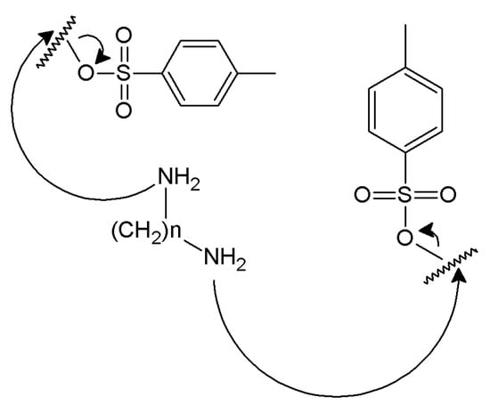 The main challenge in the synthesis was to avoid cross-linking. The tosylate group in the polymeric backbone can be displaced by each of the amine groups; one at each end of the diamine. Thus, a cross-linked structure could result. Scheme 3 shows this using structural drawing where the jagged lines represent the polymer backbone.