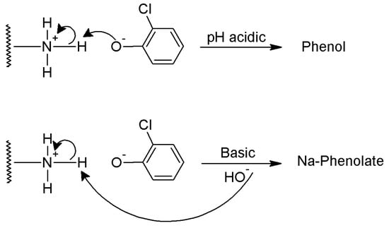 The reason for the higher amounts of phenol released with the base, for charcoal and the aminated tea, is most likely due to the higher solubility of the sodium phenoxide in water. On the other hand, under acidic conditions, 2-CP, which has a lower solubility in water compared to its sodium salt, is released. This is shown in Scheme 4.