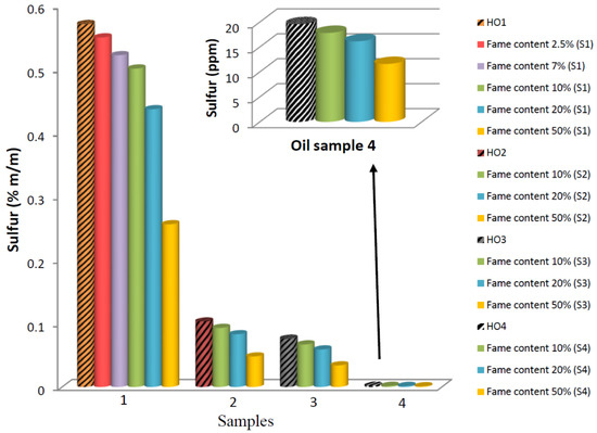As sulfur is strongly chemically combined with the hydrocarbon compounds (e.g., mercaptans (R-SH), sulphides (R-S-R), disulphides (R-S-S-R) and thiophenes), breaking of the respective chemical bonds is necessary for its removal. During fuel burning, mixtures of SOX (mainly SO2 and <5% SO3) are emitted in the atmosphere causing serious health (i.e., respiratory irritants) and environmental problems (i.e., acid rain); therefore, the amount of sulfur in the fuel is monitored and regulated. The measurements of oil sulfur content presented a reduction in sulfur content as the percentage of FAMEs increases. Furthermore, for all oil samples, it was observed that Sample 1 shows a higher sulfur percentage compared to Samples 2, 3 and 4 (Samples 2 and 3 are about the same), while Sample 4 has the lowest sulfur content of all oil samples. Only Sample 1 is over the limit specifications (max 0.1% w/w) (Figure 1).