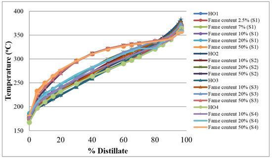 Distillation curves indicate the boiling range of the examined fuel. Distillation characteristics affect the density (fuel composition dependent), as well as the viscosity and CI. Therefore, distillation curve is an important factor for the control of fuel quality. During the distillation process, it is observed that as the percentage of FAMEs increases in oil samples (Figure 3), the distillation temperature is increased up to 80% distillate; after 85% distillate, the temperature tends to be equal. As reported by Smith et al. [32] the linearization of the curve implies that the mixture is becoming less complex in terms of the total number of components.