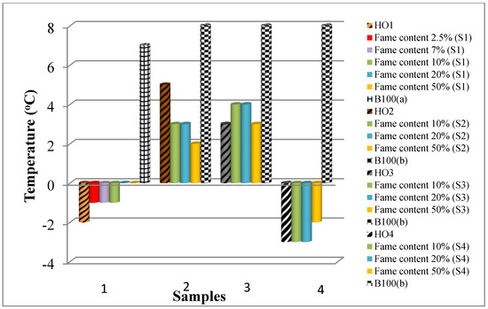 CP measurement shows the temperature where crystals first appear; thus, the fuel filters and injectors of the engine clogged. When determining the CP (Figure 4), it is observed that for oil Samples 1 and 4, as the percentage of FAMEs increases, there is an increase in the cloud point. Also, for oil Sample 2, as the FAMEs rate is increased, there is a decrease in the cloud point, while for Sample 3, there is no particular change in temperature. Cold flow behaviour is usually affected by CP, pour point (PP), and CFPP. Cold flow properties are depended on fatty ester chain length, while oxidation stability on polyunsaturated fatty esters [34]. In a study by Chhetri et al. [35], it is reported that cloud point of ethyl ester produced from waste cooking oil was found to be −1 °C. Furthermore, cloud points of ethyl esters of linseed oil, canola, sunflower, and rapeseed oil were approximately 2 °C lower than those of the corresponding methyl esters, which indicates that the ethyl esters perform slightly better in cold temperatures than the corresponding methyl esters. Furthermore, Sadrolhosseini et al. [36] reported that CP depends on the concentration of saturated fatty acids such as C16:0, C18:0, and C18:1 in the product and, through the production of biodiesel, if the new esters are derived from saturated fatty acids such as C16:0 and C18:0, the biodiesel will have high cloud point, because they act as a precursor for crystallization.