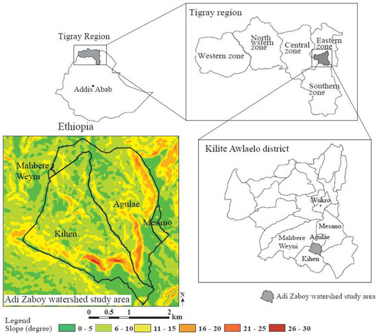 The research site was conducted in Adi Zaboy watershed located at 13°38’30” to 13°40’30” N latitude and 39°34’0” to 39°36’0” E longitude in southern Kilite Awlaelo district, Tigray Region, in northern Ethiopia. The total area of the watershed is 8.84 km2, where 53.0% of the area is used by the Kihen community, 45.0% is used by Agulae town, 1.5% is used by the Measnu community, and 0.5% is used by the Mahbere Weyni community (Figure 1). This research reported on the land management by farmers from the Kihen community and Agulae town, which combined, make up more than 98% of Adi Zaboy watershed. The topographical information on the Adi Zaboy watershed was obtained from the AW3D Digital Surface Model with a 30-m spatial resolution.W3D Digital Surface Model with a 30 m spatial resolution is a dataset created by resampling the Digital Surface Model obtained from the Panchromatic Remote-sensing Instrument for Stereo Mapping (PRISM) on Advanced Land Observing Satellite, known as “Daichi”, from the Japan Aerospace Exploration Agency (JAXA) to a horizontal resolution of 30 m [26]. The elevation difference in Adi Zaboy watershed is 290 m (maximum elevation of 2315 m above sea level, minimum elevation of 2025 m above sea level), and 24% of Adi Zaboy watershed is on a slope of more than 10°.