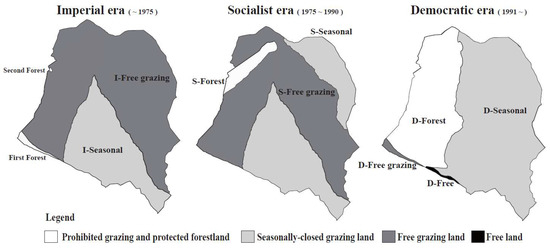- To reveal the changes in land management by farmers in the imperial era, the socialist era, and the democratic era.The land managements were classified into free land, free grazing land, seasonally-closed grazing land, and prohibited grazing and protected forest land in the study area. Free grazing lands have decreased from the Imperial era to the democratic era. From the viewpoint of environmental protection, the government-led prohibited grazing and protected forest land are expanding during the democratic era. The expansion of the prohibited grazing and protected forest land has been tightened the restriction on the use of natural resources for feed supply.
