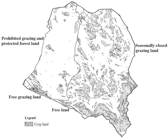 The land managements were classified into free land, free grazing land, seasonally-closed grazing land, and prohibited grazing and protected forest land. The free land is a land that has no designated use. There are houses and buildings built on the free land in the Adi Zaboy watershed. Farmers are free to develop the land for grazing or farming, and to collect fallen branches for fuel or herbaceous plant species for feed. The free grazing land is a land used for livestock grazing. Like the free land, farmers are free to graze livestock and collect branches and herbaceous plant species. However, a meeting of farmers from each village decided on a new cropland development on an as-needed basis based on the situation with the cropland or the grazing land. The seasonally-closed grazing land is a land that prohibits grazing only during the rainy season when vegetation grows from the concentrated rainfall. Its primary purpose is to secure feed for oxen that are essential to farming. People are also prohibited from gathering herbaceous plant species during the period when grazing is prohibited, but they are permitted to collect fallen branches throughout the year. The development of new croplands is not prohibited, but it is currently not taking place. These land managements were arranged voluntarily by farmers in a meeting, and the violators were fined. The prohibited grazing and protected forest land is a land where the government-led afforestation and water and soil conservation activities, such as building stone bunds for soil erosion prevention, were implemented. It is believed to have the same type of land management as the area enclosure previously presented by Nedessa and Ali et al. [8]. The government prohibits grazing in the prohibited grazing and protected forest land all year to prevent livestock from destroying the stone bunds and damaging the young planted trees. Farmers are only permitted to gather herbaceous plant species, and they are prohibited from collecting fallen branches and developing new croplands. The government also prohibits cutting down of trees under all the land managements. A violation of government regulations is a criminal act. When the types of land management are classified from the perspective of livestock grazing restrictions, the free land and the free grazing land are the areas where the farmers could freely graze their livestock; the seasonally-closed grazing land is the land where the farmers decided to limit grazing by season; and the prohibited grazing and protected forest land involves the areas where the government completely prohibited grazing activities (Table 1).