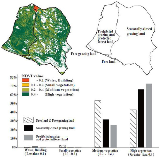 As the results of analyzing the ratio of NDVI value in the natural vegetation according to indicators of small, medium and high, the water or building was 0.6%, 1.1% and 0.3%, the small vegetation was 0.6%, 0.2% and 2.6%, the medium vegetation was 25.5%, 32.1%, and 53.9%, and the high vegetation was 73.3%, 66.6%, and 43.2%, respectively, in the prohibited grazing and protected forest land classification, the seasonally-closed grazing land classification and the free grazing land (Figure 5). When comparing the ratios of high vegetation in each type of land management, the prohibited grazing and protected forest land was 73.3%, the seasonally-closed grazing land was 66.6%, and the free grazing land was 43.2%, showing that the prohibited grazing and protected forest land tended to have the highest ratio of high vegetation. On the other hand, when the ratios of medium vegetation were compared, the prohibited grazing and protected forest land was 25.5%, the seasonally-closed grazing land was 32.1%, and the free grazing land was 53.9%. This high vegetation ratio indicated that wild herbaceous and woody plant species were able to flourish during the 20 years of restriction on the use of natural resources when most of the free grazing land had been converted into a prohibited grazing and protected forest land when its classification was established. Like the past researches, it is believed that natural vegetation can recover in the prohibited grazing and protected forest land [14,36]. In addition, many conservation activities (SWC) and afforestation activities have been carried out within the prohibited grazing and protected forest land by local farmers. Therefore, stone bunds and planted woody plants can keep rain water flowing on the slope. It was considered that vegetation growth was positively promoted by the increase of soil moisture content increase [37]. The seasonally-closed grazing land has 6.6% less high vegetation than the prohibited grazing and protected forest land. However, its ratio of high vegetation is 23.5% higher than the free grazing land where livestock is freely dispatched. Therefore, it showed that the grazing restriction during the rainy season in the seasonally-closed grazing land enhanced the growth of wild herbaceous and woody plant species and promoted regeneration of vegetation from seeds and fruition, which increased the capacity to secure and supply more livestock feed resources. Also, the spray of livestock manure during grazing period which results is supplying organic matter and nutrients into the soil would positively promote the growth of wild herbaceous plants and wild wood plants in the seasonally-closed grazing land.