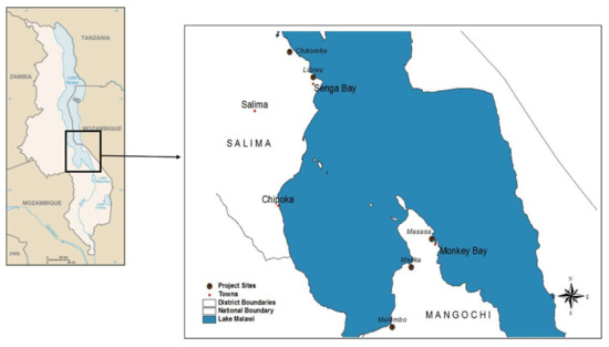 Lake Malawi is a large freshwater water mass in southern Africa with a surface area of about 29,000 km2, and a length of about 700 km. The lake’s catchment covers about 130,000 km2 and includes much of the east of Malawi, the south-western corner of Tanzania and the north-western corner of Mozambique (Figure 1). Lake Malawi lies in the Great Rift Valley system of Africa. It is very deep (The deepest part reaching about 800 m) and has varying landforms ranging from extensive plains, particularly in the south, to steep-sided mountains in the north. The water of the lake provides a habitat to 15% of the world’s freshwater fish species [21]. Lake Malawi has a very rich biodiversity with over 800 fish species, most of them endemic to the lake. It is regarded as one of the world’s important freshwater lakes and was declared a world heritage site in 1984. Lake Malawi and its catchment is a source of livelihoods to many Malawians. The lake itself provides over 90% of fish supply in Malawi which contributes over 70% of the total animal protein supply in Malawi [5].