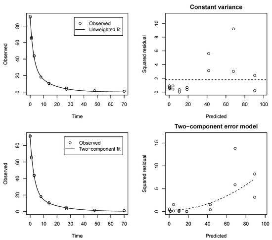 Only in two cases, ordinary least squares fitting provided the lowest AIC value. The variance by variable error model led to the lowest AIC for four of the datasets. In the remaining five cases, the two-component error model gave the lowest AIC, indicating that the error structure was most adequately represented by this error model.