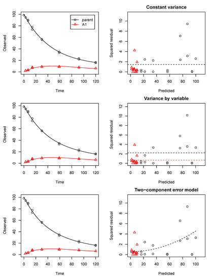 The error models generally used for the concentration data in such evaluations either assume constant variance (ordinary least squares (OLS)) across all concentrations for all observed compounds and compartments (error model “constant variance”) or alternatively allow for a different variance for each observed variable [6]. For the latter error model, fitting by the iteratively reweighted least squares (IRLS) method is now widely used in regulatory risk assessments due to its availability in the kinetic evaluation software packages KinGUII [10] and CAKE [11]. In this study, we will refer to this error model using the term “variance by variable”, as it can not only be used for the case of different variances of parent compound and metabolite concentrations, but also to allow for different variances for the concentrations of the same compound in different matrices.