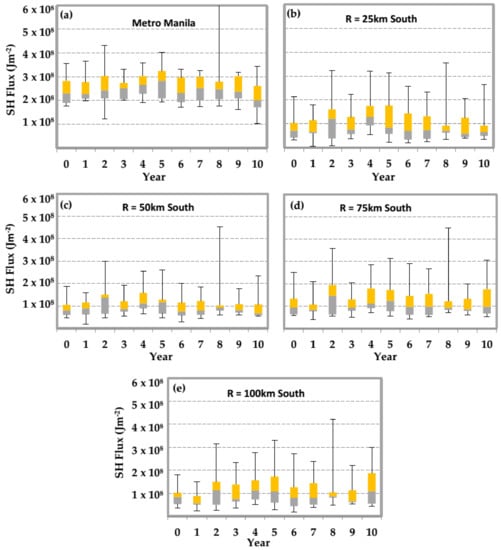 It can be seen in Figure 2a–e and Figure 3a–e that there is no significant difference in the magnitude of the average sensible heat flux when comparing sites north and south of Manila. Similar results were obtained for areas east and west of Manila. Further, even the sensible heat flux of selected areas 25 km from Manila was almost the same as for all directions and all distances away from Manila. The 25 km area seems unaffected by the urbanization happening in Metro Manila. Therefore, the urbanization of Metro Manila only affects its sensible heat flux. Moreover, for the period of the study (2000–2010), Manila’s sensible heat flux has remained constant at about 2.5 × 108 Jm−2. This indicates that the level of urbanization of Metro Manila, as measured using sensible heat flux, has leveled off for the 2000–2010 period. There may be more development taking place in the area, but the sensible heat flux parameter does not indicate this detail.