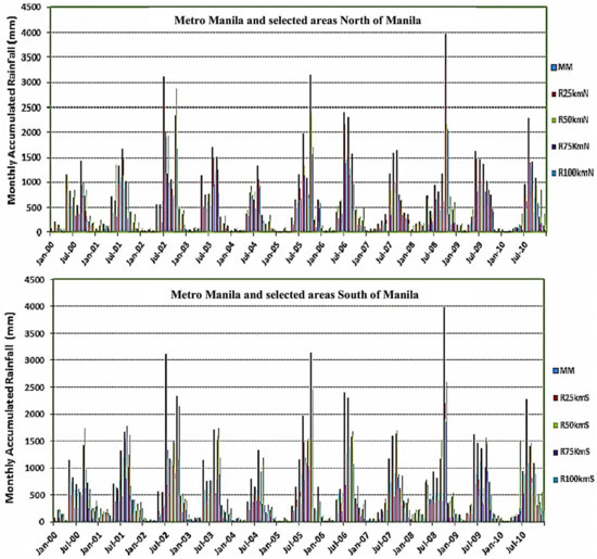 Figure 4 shows the time series of the monthly accumulated rainfall of selected urban and rural areas north and south of Manila for the period 2000–2010. This figure illustrates the durations of dry and wet seasons, with large volumes of rainfall measured for the month of June up to November, and rainfall falling below 500 mm for the remaining months. Similar characteristics were obtained for the selected sites categorized by MCC as Type I or Type III.