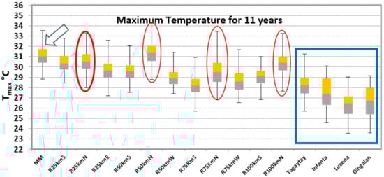 As can be observed from Figure 6, the average Tmax of Metro Manila (about 31 °C) is larger than the Tmax of all the other sites selected except for Angeles City (about 31.5 °C) which represents the 50 km north dataset. The Tmax of Metro Manila corresponds to the average maximum temperatures of Manila, QC and Pasig. In addition, Angeles City can be considered a highly urbanized city due to conversion of an airbase into commercial, industrial and residential buildings. This is convincing evidence that pavements and vertical structures are linked to surface temperature increases during daytime. This brings discomfort and may cause serious health problems for urban dwellers [31].