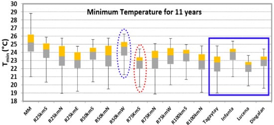 The minimum temperatures, Tmin, of selected urban and rural areas for the period 2000–2010 are shown in Figure 7. Just like the results of Tmax, the highest average Tmin is recorded in Metro Manila compared with all the other sites selected. The sites selected have an average Tmin that is lower than the average Tmin of Metro Manila, in the ranges of 0.4 °C to 2.4 °C. The sites included in the blue box have the same variation in Tmin as the other sites and their average Tmin is mostly lower than the average Tmin of the other sites.