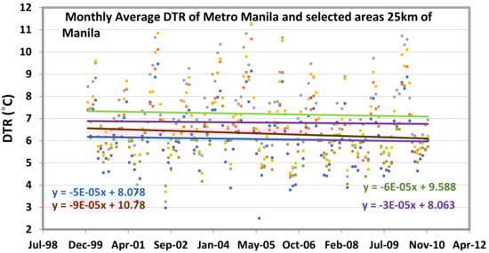 It is observed that over the period of study (2000–2010), the DTR values of Metro Manila and the selected sites were not affected by urbanization of Metro Manila.