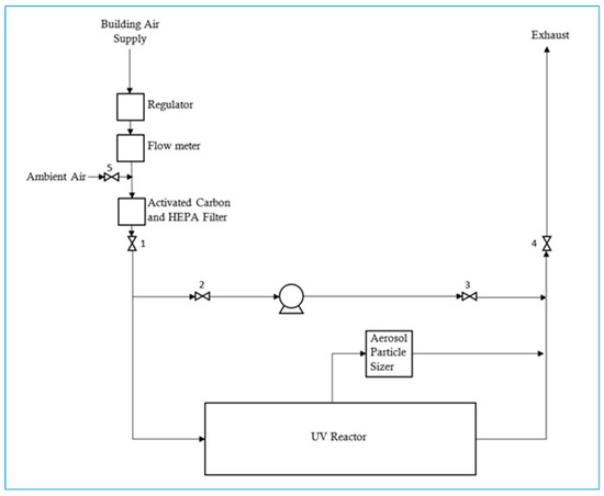 A diagram of the experimental setup used for this project is shown in Figure 1. The system setup consisted of a custom-built UV reactor vessel, containing a UV lamp running the length of the reactor. The air in the system was recirculated using a Cole Parmer Masterflex peristaltic pump, with 60 cm of Masterflex size 17 Norprene tubing with a 6.4 mm inner diameter. The rest of the tubing used for recirculation was 370 cm of 0.935 cm (inner diameter) polytetrafluoroethylene (PTFE) tubing. The recirculation rate of the system gas was 415 mL/min, which is equivalent to one vessel air exchange every 63.5 min. For the majority of the experiments, the air supplied to the UV reactor was compressed air from the building’s system and was passed through an activated carbon/HEPA (high efficiency particulate air) filter PureFlo SKL Capsule (Saint-Gobain, Gaithersburg, MD, USA). This ensured that the air was relatively dry with a relative humidity of around 11%, with the filtration removing most particles larger than 0.3 μm diameter. In addition, some experiments were carried out with unfiltered compressed air, as well as with filtered and unfiltered room air with a relative humidity greater than 11%.