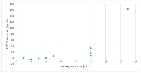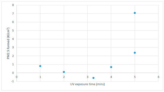 Fine particulate matter (PM2.5) formation (corrected for initial background counts) as a function of UV exposure time, with a constant recirculation time of 5 min after UV exposure, for initial toluene concentrations in air of 55 to 85 mg/m3. Triplicate experimental results are shown for 10 min.