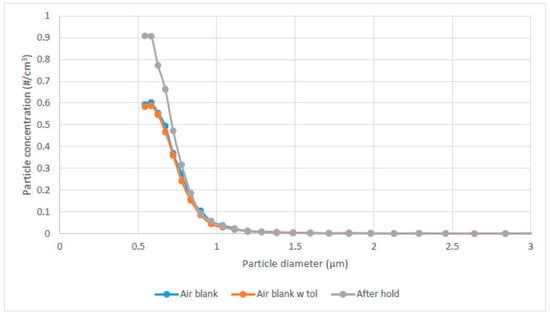 For the automated UV room disinfection units of interest, the typical exposure time was set for 5 min as this is generally found to provide a satisfactory disinfection dose [1]. Therefore, focusing on the 5 min of UV exposure, further experiments were performed to assess the particle size distribution within the range measurable by the TSI instrumentation, with the results shown in Figure 3. These results indicated that: (1) the injection of the toluene did not create particulate on its own (comparing air blank to air blank with toluene), and (2) most of the detectable particulate generation occurred at sizes less than 1 µm.