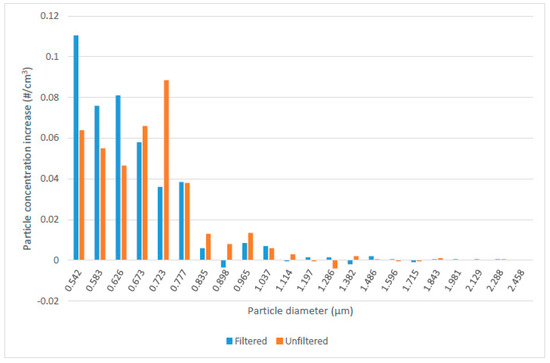 Effect of HEPA filtered versus unfiltered compressed air on generation of particulate at various sizes with 5 min of UV exposure and 1 min of recirculation (initial toluene concentrations 55 to 85 mg/m3).