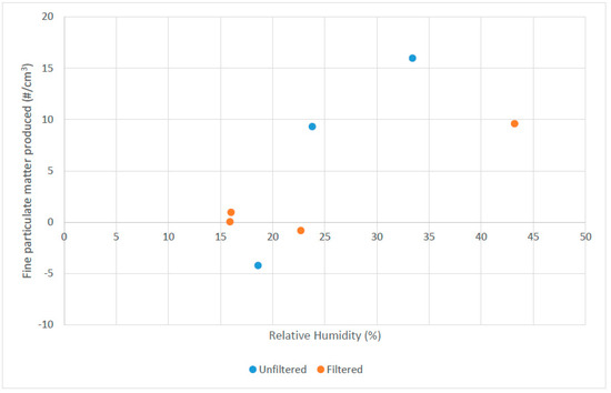PM2.5 production for filtered and unfiltered room air at different relative humidities. Initial toluene concentration was between 55 and 85 mg/m3, with 5 min of UV exposure and 1 min of hold time before sampling. The initial particulate counts for unfiltered and filtered air were approximately 43 × 106 and 5 × 106 particles/m3, respectively.