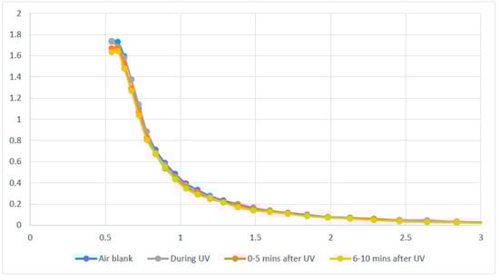 Particulate size distribution (particulate counts per cm3 versus particle diameter in µm) in a bathroom with an above-door automated UV system, before (air blank), during and after an automated 5 mins UV disinfection cycle. Most points are collinear and superimposed.