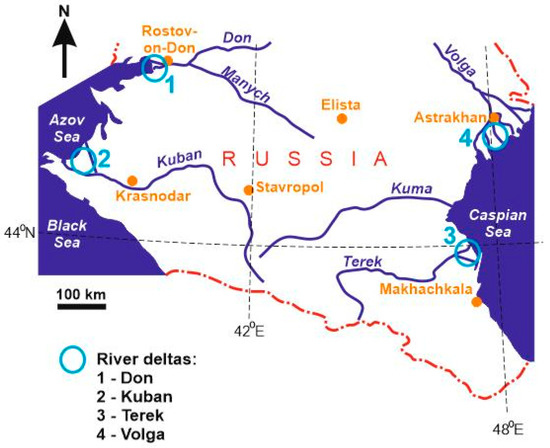 Location of the deltas of the Don and the other large rivers of the Russian South; created by the authors.