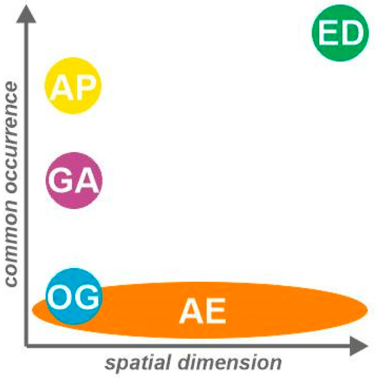 Parameters of the deltaic geoheritage categories; abbreviations: AE—delta-associated features resulting from geology-ecosystem interactions, AP—delta-associated “purely” geological features, ED—entire-delta geological phenomenon, GA—geoarchaeological localities in deltas, OG—geological features occasional to deltas. Image created by the authors.