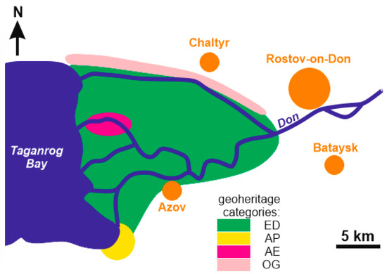 The inventory of the Don River delta geoheritage permits the establishment of the ED, AP, AD, and OG categories, according to the classification proposed above. Although important archaeological sites are known in close proximity to the study area [34], these are not linked directly to the delta. Further consideration of the archaeological context may result in the identification of representatives of the GA category.
