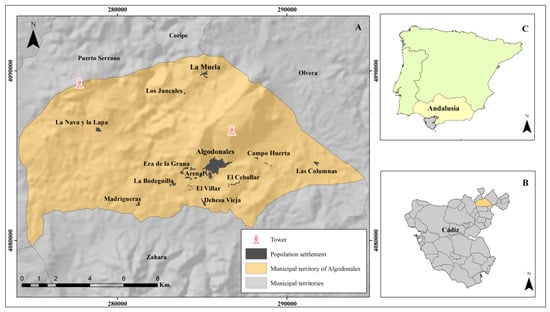 Study area (A) Municipality of Algodonales; (B) Algodonales in the province of Cadiz; (C) Province of Cadiz in Andalusia (Spain).