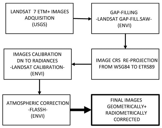 Before employing the Landsat 7 ETM+ images used to estimate the amount of plant humidity and produce fuel models maps, several geometric and radiometric corrections were made to eliminate alterations that might affect the imagery due to various factors such as the Earth’s rotation, atmospheric effects or internal problems of the sensor itself [], and owing to the existing correlation between the variables of interest (humidity) and the state of the atmosphere []. In sum, the procedure followed is indicated below and shown in Figure 2.