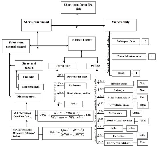 To estimate this sort of flexible term (mid/short-term) risk maps, two kinds of factors have to be considered, namely static and dynamic. In the case of natural hazard elements, static or fixed factors are (i) slope gradient and (ii) combustible type, while for the more time-dynamic factor (iii) moisture stress of the vegetation was chosen. To obtain induced hazard, only fixed factors are considered; thus, (iv) the closeness of causative elements [] was taken into account, both as a distance or as a travel time on foot from some of those elements (roads, paths, settlement and recreation areas), as a way to estimate people’s penetration capacity in the forest environment. Finally, (v) vulnerability was calculated taking into account how prone certain considered elements were before an eventual fire. The methodology is detailed below, see Figure 3.