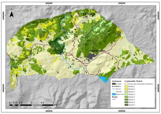 The type of combustible or fuel is another key factor in fire behaviour because it affects the speed and intensity of flame propagation and determines the difficulty of controlling the fire [,,]. Multiple vegetation characteristics can influence the fire’s spread: Spatial distribution, combustibility, horizontal or vertical continuity, etc. Hence, and to facilitate fire prediction work, several fuel models have been duly created, the aim being to classify plants according to their characteristics and see how they influence the speed and intensity of flame propagation. One of the classifications most used was proposed by Rothermel in 1972 []; ICONA (Nature Conservation National Institute) adopted it for the entire national territory. That classification distinguishes among 13 fuel models depending on the flame-spreading element. Those 13 models are grouped in four broad categories: Pastures, scrub, leaf litter under trees and cutting debris and forestry operations [,,]. From these original 13 fuel models, only 11 have been correctly identified in Andalusia [], and from these 11 types, only 9 exist in the study area.