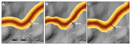 - Choice of the maximum value of length among those provided per Euclidean distance, see Figure 5A, and travel time, see Figure 5B: In areas with steep slopes, the maximum length reached was 50 m, whereas, in flatter areas, 208 m was reached, see Figure 5C.