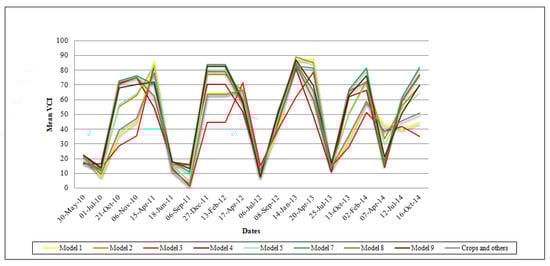 The VCI gives values between 0 and 100 and reflects the relative variability in vegetation conditions, whereby values close to zero indicate severe dryness conditions while those close to 100 indicate optimal humidity conditions [,]. The VCI for each date was later reclassified in five classes with the same range (every 20). Those classes were established based on the humidity conditions obtained by interpreting the aforementioned VCI. For each class, a numeric index was accordingly established, as shown in Table 3.