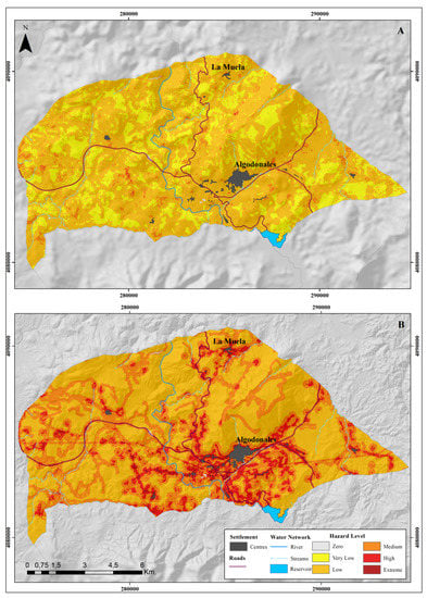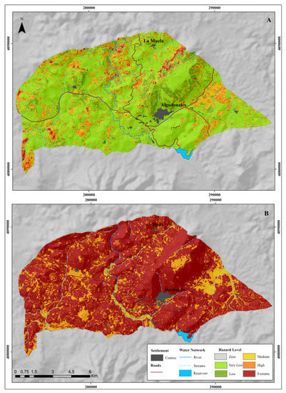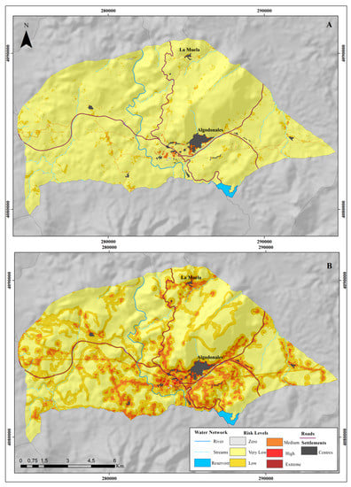 Final hazard map (natural + induced). (A) 14 January 2013. (B) 25 July 2013.
