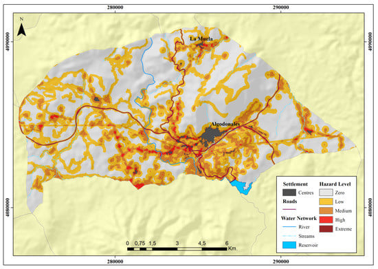 The mapping of induced hazard obtained after implementing the proposed methodology shows different hazard levels based on the presence/absence of causative elements, their proximity and human penetration capacity in the forest environment. The mapping hence shows that the areas with higher induced hazard correspond to areas that are greatly affected by humans, where the concentration and intersection of various causative elements occur. These areas are mainly located in the municipality’s southern quadrant, around the main centre; although, also around the secondary centre of La Muela and close to dispersed settlements situated west of the main centre, see Figure 8. The areas with medium hazard are those close to routes of communication and extend to where a person is able to travel in the maximum stipulated time. The fact that the areas with maximum hazard are found near infrastructures such as routes of communication or population centres is significant in so far as those are the areas where a fire is more likely to break out and within a short time affect some of those elements, with serious consequences: blocked roads or damage to settlements.