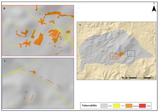 The vulnerability map shows areas most liable to suffer some damage when affected by a fire, see Figure 10. Given that to obtain the vulnerability in this article, only very specific elements associated to humans were taken into account; the highest vulnerability levels are found in areas where there is a spatial coincidence of several of those vulnerable elements (settlements, routes of communication, electric power infrastructures). Most of the population settlements present more vulnerability than the other elements because the losses that can be caused by fire, besides the material ones, can be personal. Such areas are very exposed to possible fire in summer as shown by the July hazard mapping, where the areas with most hazard are found close to population settlements and routes of communication.