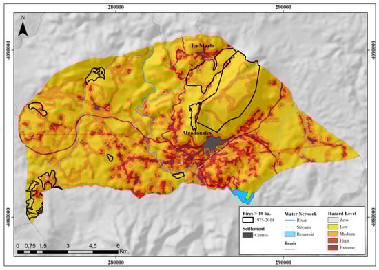 Although the municipality of Algodonales was not affected by forest fires in the studied period, a comparison has been made among obtained maps and burned areas data (1975–2014) available from REDIAM, see Figure 12. In spite of the unknown causes of these specific forest fires, it can be observed that most of the fire perimeters include areas of high hazard level from where outbreaks of fire can take place; thus, in a first approximation, these areas should be considered in incoming fire prevention planning.