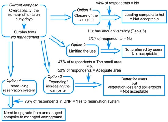 The foregoing discussion clearly demonstrates the need for management at the Kuro-dake Campsite. Field observations, interview surveys and previous studies [,] reveal four options to deal with the erosion and overcrowding at the Kuro-dake Campsite (Figure 23). Closure of the campsite (Option 1) would be the most effective measure to stop further human impact [,]. The shelters in Isle Royale National Park have a good effect in shielding resources when compared to campgrounds [,]. The collected data of the number of overnight users at the Ishimuro hut suggest that making better use of the available space in the hut would help to reduce the pressure on the campsite. There are vacancies in the hut even when the campsite is full (Table 5). However, 94% of the respondents disagree with the site closure (Figure 20a). Although there are always enough vacancies in the hut, 89% of the respondents do not want to stay in the hut and prefer the freedom of the campsite (Figure 14). Therefore, this option would not be accepted by most campers.