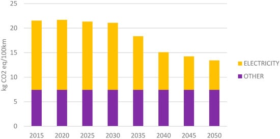 CF and WF analyses of current and future EVs were performed considering the changes in the sources of electricity mix in the CR (Figure 5 and Figure 6). Based on the inventory of electricity generation in the CR in the years 2015–2050, data for current and future electricity were identified. Other elements (such passenger car production, battery production, maintenance, and road wear) remain constant over the different time horizons of the study. The obtained results showed that the CF of EVs was 21.53 kg CO2eq/100 km in 2015; in 2050, the potential impact on CF will be 13.42 kg CO2eq/100 km. The value of the CF from 2015 over the next 35 years will decrease. The WF was 0.134 m3/100 km in 2015; in 2050 the potential impact on WF will be 0.138 m3/100 km. The value of the WF from 2015 over the next 35 years will increase.