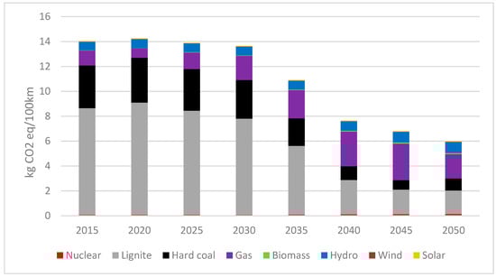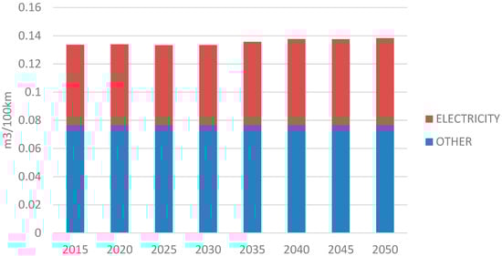In the paper, we assess the carbon and water footprint of electric vehicles and provide a comparative analysis of energy use from the grid to charge electric vehicle batteries in the Czech Republic. The analysis is done for the period of 2015–2050 based on the Eurostat database, which provides a summary of expected trends in electricity generation by source []. The outlook is summarized in Table 2. In the future, an increase in the generation of nuclear energy and energy from alternative sources, such as solar, water, and biomass-waste, is expected. A decrease is expected in electricity generated from solids. From 2020 onwards, electricity generation from oil is not expected.
