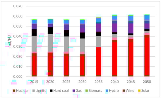 Based on the electricity generation by source in the CR in the years 2015–2050, the shares of individual sources of electricity supply for carbon footprint and water footprint were analyzed. Figure 7 shows a carbon footprint from individual energy sources for electric vehicles battery charging in the CR. Figure 8 shows a water footprint from individual energy sources for electric vehicles battery charging in the CR.