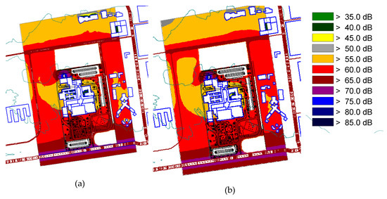When calculating reflections (only the first reflection was considered), the principles of the European Directive were followed. Meteorological conditions were configured as those stablished as default values in Toolkit 17 of the ‘Good Practice Guide for Strategic Noise Mapping and the Production of Associated Data on Noise Exposure’ report [53]. Finally, a mesh of 1 m × 1 m was chosen for the configuration of these calculations, since this was considered to be sufficiently representative of the dimensions of the area. The calculations were carried out at different heights from 1.5 m to 10 m above the ground, including 4 m as indicated in the European Directive.
