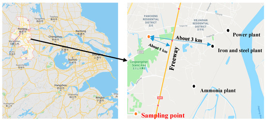PM2.5 were collected in the campus of Nanjing University of Information Science and Technology (32°12′9″ N, 118°42′49″ E), which is surrounded by chemical companies, residential areas, and farmland, and is 1 km from the freeway. The sampling site is located at the top of the library, about 25 m above the ground and without high-rise buildings around (Figure 1). Two seasons were chosen for PM2.5 sampling (33 samples for summer, 32 samples for winter): The summer sampling was conducted from June to August 2016, and the winter sampling was from December 2016 to February 2017. The sampling time was from 9:00 a.m. to the next 7:00 a.m. A high-volume air sampler (Tisch Environmental, Cleves, OH, USA) was used to collect PM2.5 samples with a flow rate of 1.13 m3/min. PM2.5 were collected by a quartz filter (203 mm × 254 mm, Whatman, UK). Before sampling, all quartz filters were placed in a muffle furnace at 450 °C for 4 h to remove any organic matter and wrapped with aluminum foil within a desiccator for 24 h. Similarly, the quartz filters were desiccated after collection, and each was weighed three times. The difference in filter mass before and after sampling was recorded as the mass of PM2.5 collected. All the PM2.5 filters were then stored at −20 °C in the dark for further analysis. Filter blanks were also prepared at the same time and in the same way.