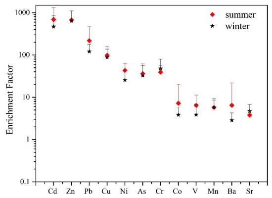 The metal enrichment factor (EF) was also calculated to differentiate the anthropogenic sources from natural process, using Al as the reference element according to Senaratne’s study [36]. As shown in Figure 2, the EF values of Zn, Cd, and Pb were far greater than 100 (except for Pb in winter), indicating that these elements were heavily enriched and strongly affected by human activities. Previous studies have demonstrated that Cd and Zn usually originated from metal smelting, electric batteries, electroplating, pigments, building materials, and coatings [37]. The Pb content in PM2.5 was higher in summer than in winter (p < 0.05), which is consistent with the observations of Liu Fengling in Nanjing and which may be due to the difference in industrial emissions during the sampling period [28]. Cu, Cr, As, and Ni also had EF values greater than 10, indicating that anthropogenic sources made an important contribution to these PM2.5-bound elements. In contrast, The EF values of V, Mn, Co, Ba, and Sr were all less than 10, which is consistent with the findings that these elements were commonly from both human activities and nature emissions [38]. The correlation between the mass concentration of heavy metal elements (average values of summer and winter samples) are shown in Table 2. A correlation coefficient of 0.470 (p < 0.01) was noted between As and Sr, and both were generally considered to be trace elements of coal combustion, especially from coal-fired power plants [39,40]. The correlation coefficients between Pb with Cu, Mn and V were 0.452, 0.394 and 0.568 (p < 0.01), respectively. Pb, Mn, and Cu were thought to be signs of traffic emissions [41,42]; the use of fuel additives and combustion of fuel will lead to the emissions of these metals [43]. These results suggest that human activity, especially industrial activity, traffic transportation, and dust, has led to severe metal pollution in PM2.5 at the sampling site.