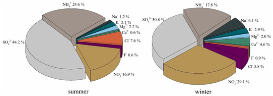 Figure 3 shows the proportions of water-soluble ions (WSI) in PM2.5. For summer and winter particles, the ionic components accounted for 31.4% and 38.6% of the total mass of PM2.5, respectively. Compared with other regions, the proportion of WSI was lower than Zhengzhou’s 66.1% [44], higher than Xiamen’s 24.4% [45], and close to Beijing’s 38.6% [46]. The concentrations of nine ionic species followed the order of SO42− > NH4+ > NO3− > Cl− > Mg2+ > K+ > Na+ > Ca2+ > F− in summer, while the concentrations followed the order of SO42− > NO3− > NH4+ > Cl− > Na+ > Ca2+ > K+> Mg2+ > F− in winter. Among these ions, SO42−, NO3−, and NH4+ (referred to as SNA) generally had the highest concentrations, and the sums of SNA made up 85.7% and 77.8% of the measured water-soluble ions in summer and winter, respectively. Generally, these three ions were rarely discharged from primary sources, as they were mainly from secondary reactions instead [25]. Therefore, the high contents of SNA in PM2.5 indicated the high frequency of secondary pollutions in this area. Besides, the concentration of SO42− in summer was higher than that in winter (p < 0.01), which may be explained by the enhanced photochemical oxidation of SO2 during warm periods. In contrast, the NO3− concentration was lower in summer, which may be conducive to the effective conversion of semi-volatile nitrate to gaseous state at high temperature. In addition, significant differences were observed for Na+ and Ca2+ ion concentration (p < 0.01) between summer and winter particles. Higher percentages of these two ions in winter may be associated with crustal dust or construction around the sampling point, and they could hardly be dispersed under unfavorable meteorological conditions during cold weather [47]. The ratio of NO3−/SO42− was also used to explore the sources of PM2.5 pollutant. It is considered that the mobile source is dominant when this ratio is greater than 1, while the fixed source is dominant when the ratio is less than 1 [48]. The ratios of NO3−/SO42− in summer and winter particles were 0.38 and 0.94, respectively, indicating again the major contribution of fixed sources (many chemical plants around) in this area [49].