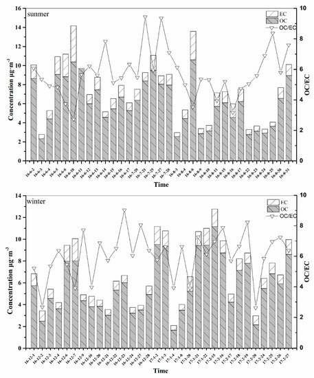 Changes of organic carbon (OC), elemental carbon (EC), and OC/EC ratios in PM2.5 in summer and winter.
