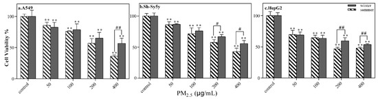 Cell viability of A549, Sh-Sy5y and HepG2 cells exposed to different concentrations of PM2.5. (* p < 0.05, ** p < 0.01: Significant differences between each treatment group and the control group was; # p < 0.05, ## p < 0.01: Significant differences between summer and winter samples).