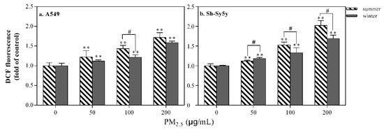 The relative change in reactive oxygen species (ROS) production in A549 and Sh-Sy5y cells exposed to different levels of PM2.5. (* p < 0.05, ** p < 0.01: Significant differences between each treatment group and the control group was; # p < 0.05, ## p < 0.01: Significant differences between summer and winter samples).