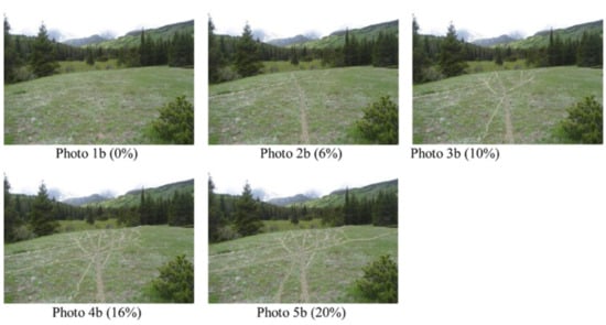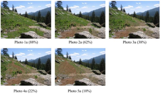 Two unique sets of photographic stimuli, each containing five different variants of the same scene, were created using commercially available digital photo editing software. One set of photographs contained a forest meadow in Rocky Mountain National Park, with or without increasing frequencies of informal and social undesignated social trails. The experimental manipulation added additional trails to each image in a manner that represented actual impact densities that were observed in the park, providing a range of stimuli in the set, from an absence of social trails to an intersecting network of social trails. All of the trails in the photos were approximately the same condition class. The second set of photographs depict a hillside vista in Rocky Mountain National Park, with increasing amounts of vegetative loss that could be created via visitor trampling, thus creating a visitor-created site. The manipulation altered the percent of vegetation loss along a continuum from an absence of vegetation loss to 80% of the vegetation loss from the site. Thus, a total of ten photographs, five for the hillside visitor-created site and five for the meadow containing social trails, were created to simulate various amounts of resource impact by visitors (Figure 1 and Figure 2). All of the photos were used and validated in a previously published study examining perceptions of ecological conditions in Rocky Mountain National Park [].
