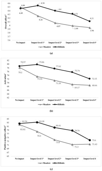 We conducted three separate 2 (impact scene—meadow with social trails and hillside with visitor-created site levels) by 5 (impact level—no impact, impact level 1, impact level 2, impact level 3, and impact level 4) Repeated Measures Analysis of Variance (R-ANOVAs) models, each with different dependent variables: Overall affect, activation level, and positive–negative valence. As predicted, all three R-ANOVAs showed a main effect for environmental impact. As environmental impact became more severe, participants reported a lower overall affective state (Figure 3a), lower overall activation (Figure 3b), and less positive valence (Figure 3c). Additionally, all three analyses indicated a main effect for impact scene type, as well as a significant interaction between impact scene type and impact level (see Table 1).